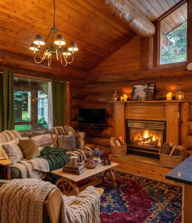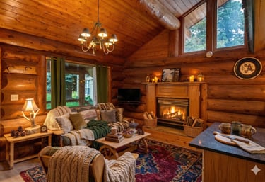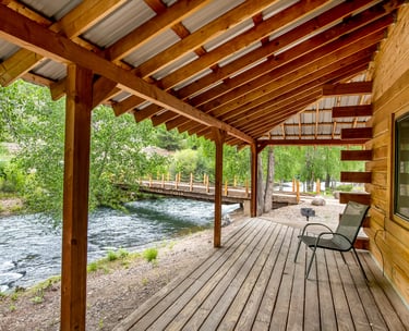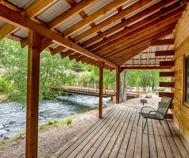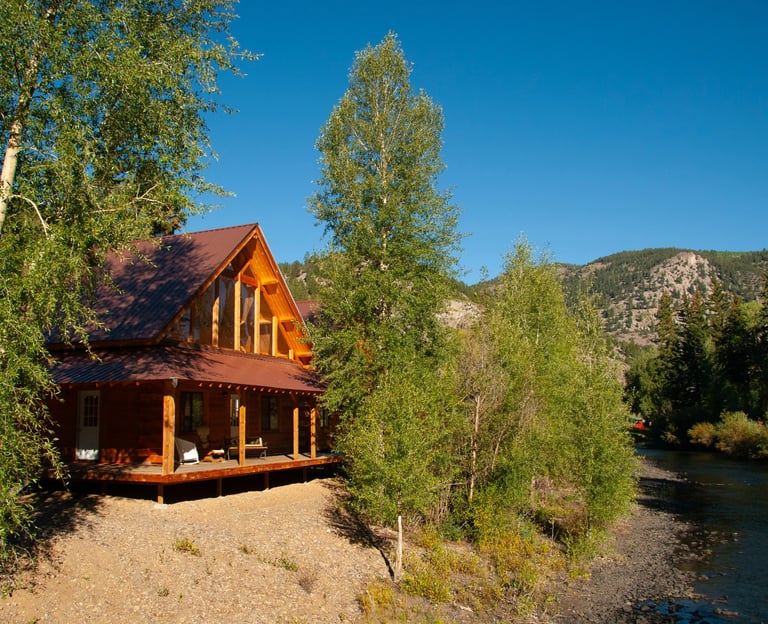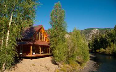 Relax after a day on the trails in this spacious River Front Elite Log Cabin with mountain views and cozy rustic charm.